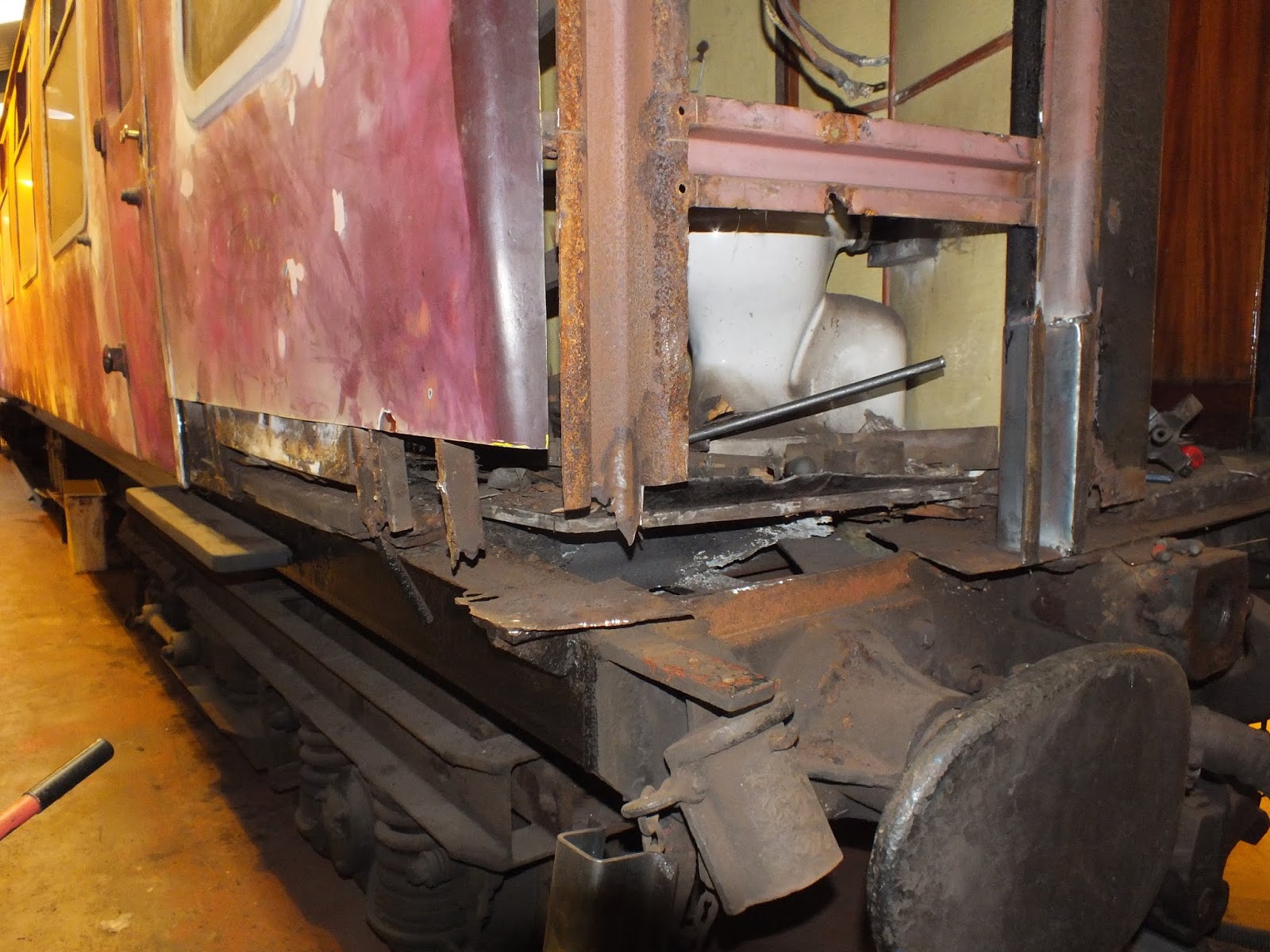 Focus has continued to be at the Sheringham end, as the Holt end metal repairs have been suspended whilst we help out the Locomotive Department with welding work on the Class 31 diesel loco. However we have painted the window aperture around the landward side toilet which will allow the window to be refitted fairly soon.
