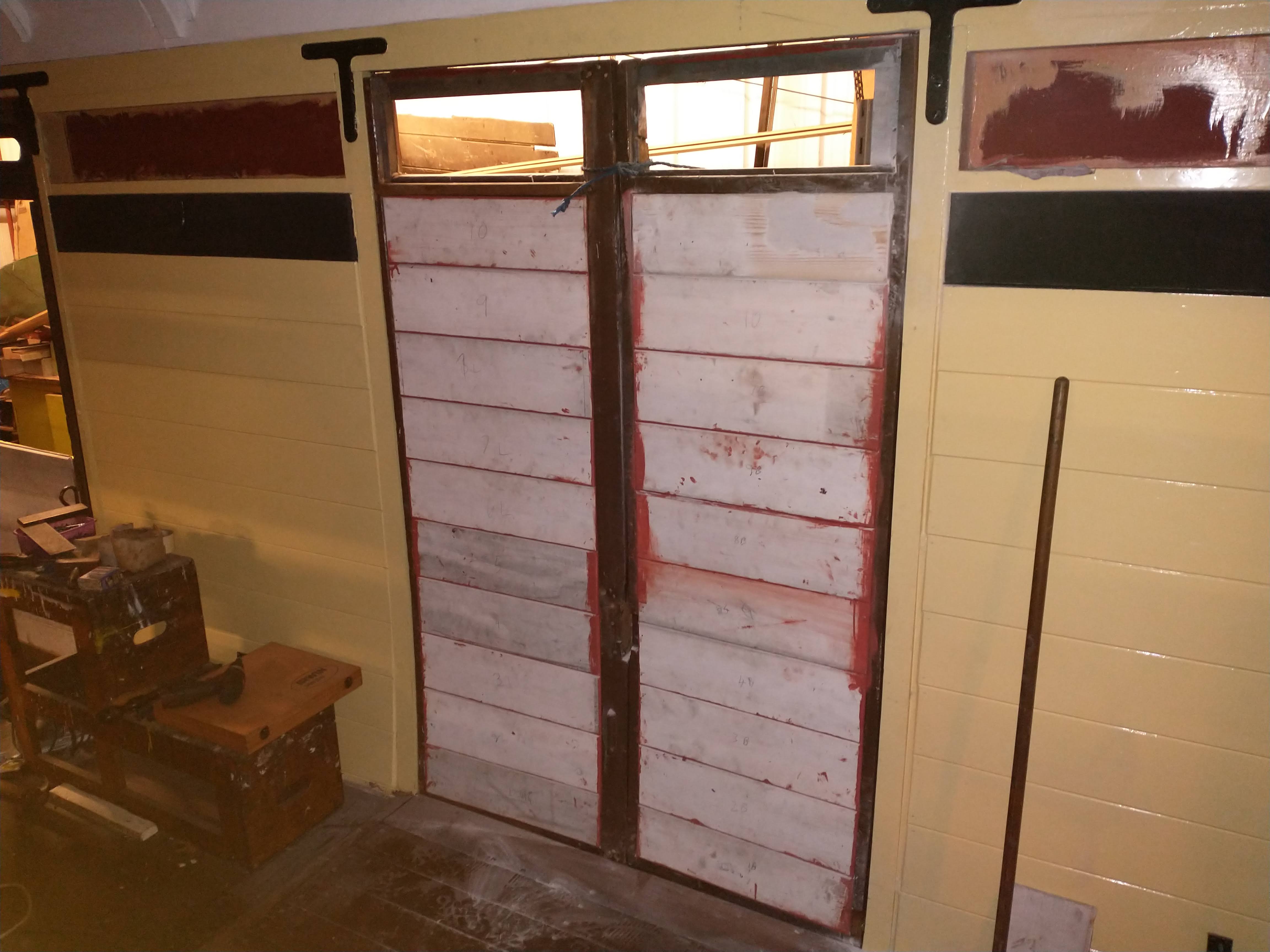 Also in progress are the varnished corridor end hinged doors. Several rotten panels were removed some time ago and new ones are being made from strips glued together and then planed flat. The replacement set has been machined and any holes and gaps filled.