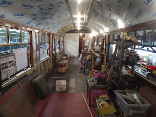 Bodywork on the landward side close to the guards compartment has extended as far as the double set of doors in the kitchen (former luggage) area. Old skin has been chopped out and replaced with new along with a further section of repair skirting. The whole areas from doorway-to-doorway is being prepped also ready for some primer.