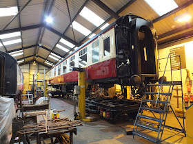 It's place was taken by the first of the coaches requiring work to form a set of open coaches again for possible use later in the year as and when Covid restrictions are further relaxed. This candidate was Tourist Second Open M4958 and progress on its remedial work has been swift. A failed buckeye coupling has been swapped for an example which has been rebuilt having been removed earlier this year from another vehicle. Also replaced has been one of the brakegear safety slings under the bogie which had been removed temporarily a little while ago for measuring. The wheelset roller bearings have also been cleaned out and fresh grease applied.